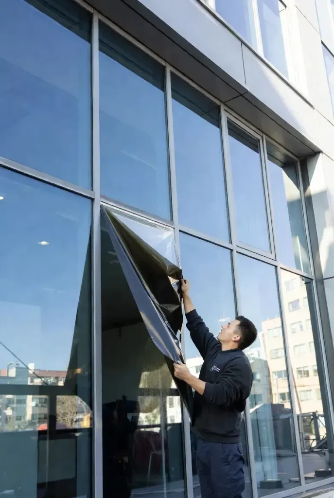 Commercial window tinting being installed on modern office building in Melbourne for glare control and privacy